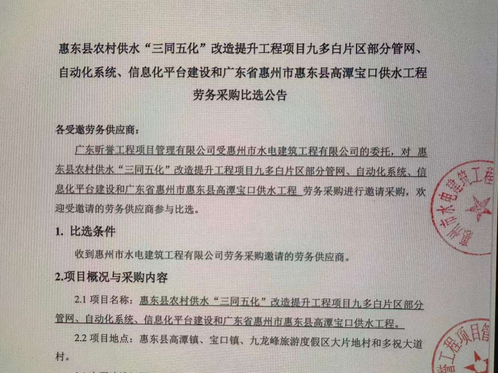 廣東省惠州市中心城區地下管網系統提升工程-內街小巷排水管網病害修復及錯混接改造項目一期施工勞務采購(第二次)中選候選人公示……